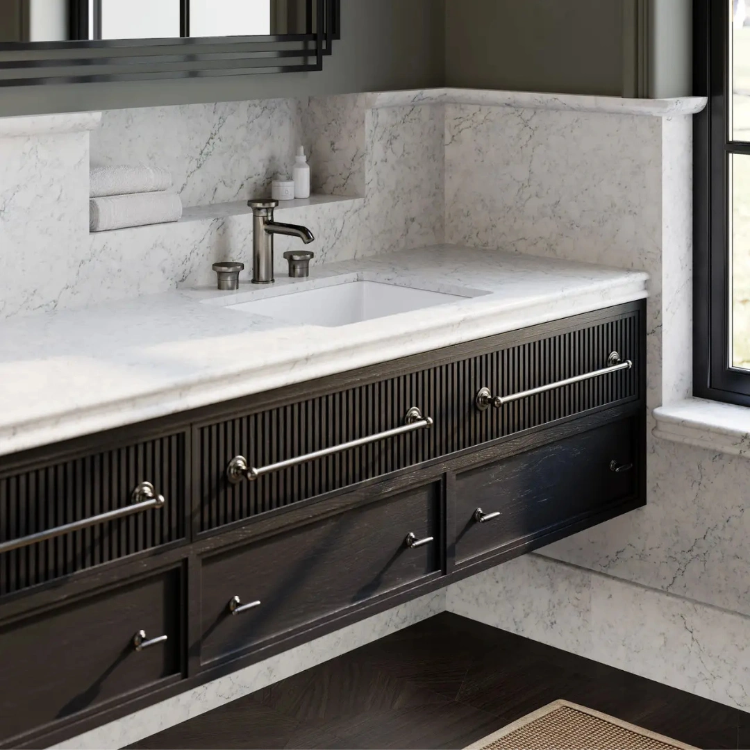 Delicate deep green veins flow across a crisp white background, enhanced by sophisticated charcoal marbling and soft swirling gray tones.