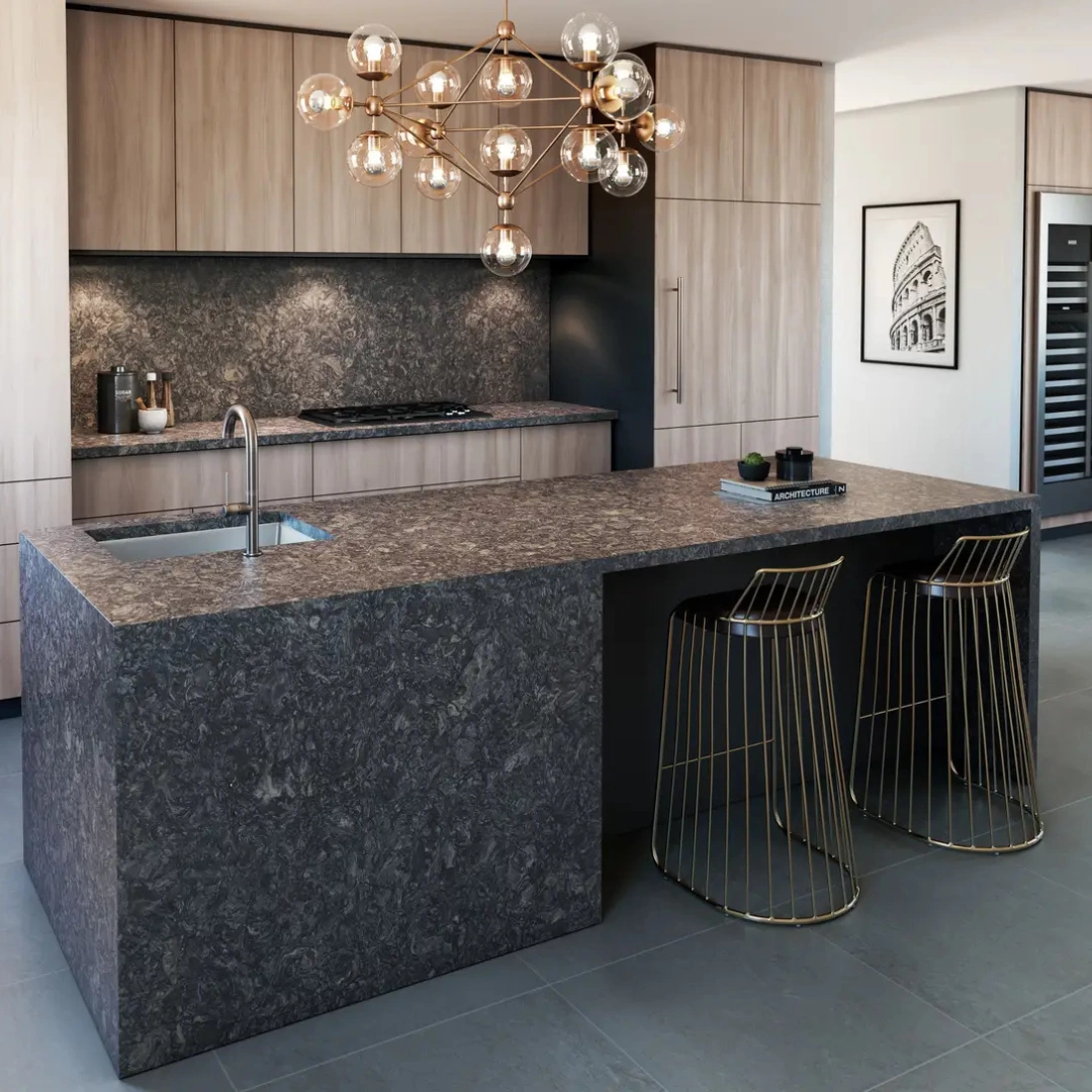 Ashbourne Matte showcases a captivating blend of monochromatic tones, from light gray to deep charcoal and black, swirling together in an intriguing pattern.